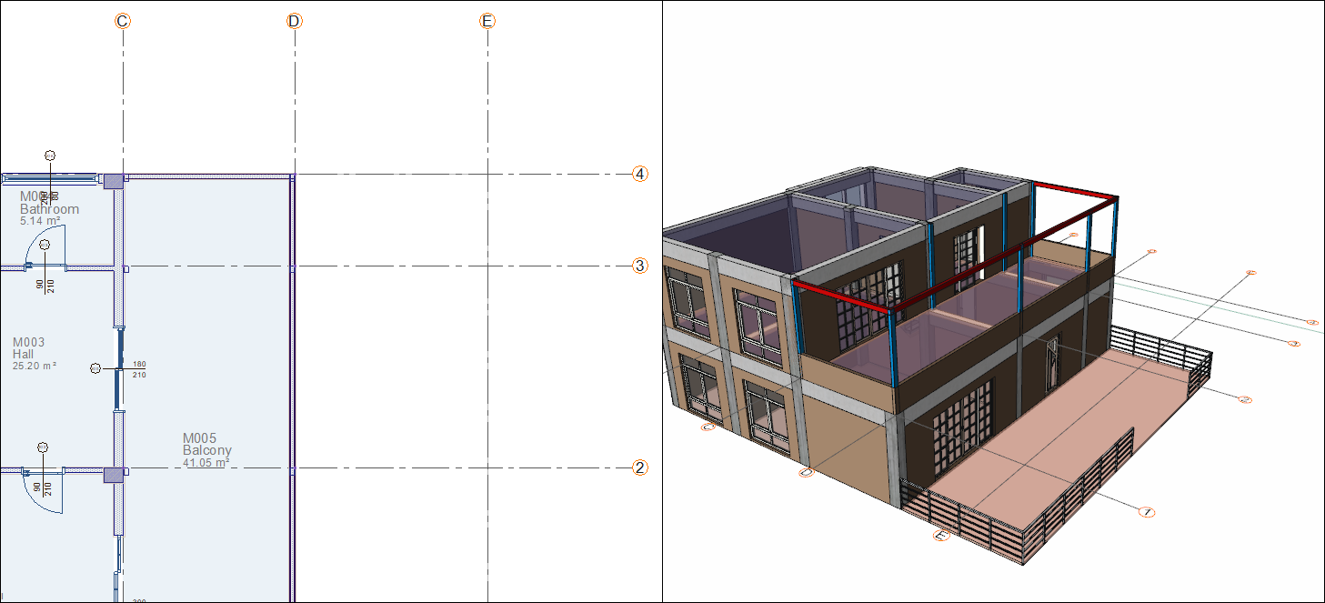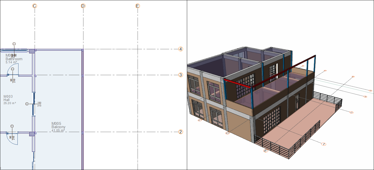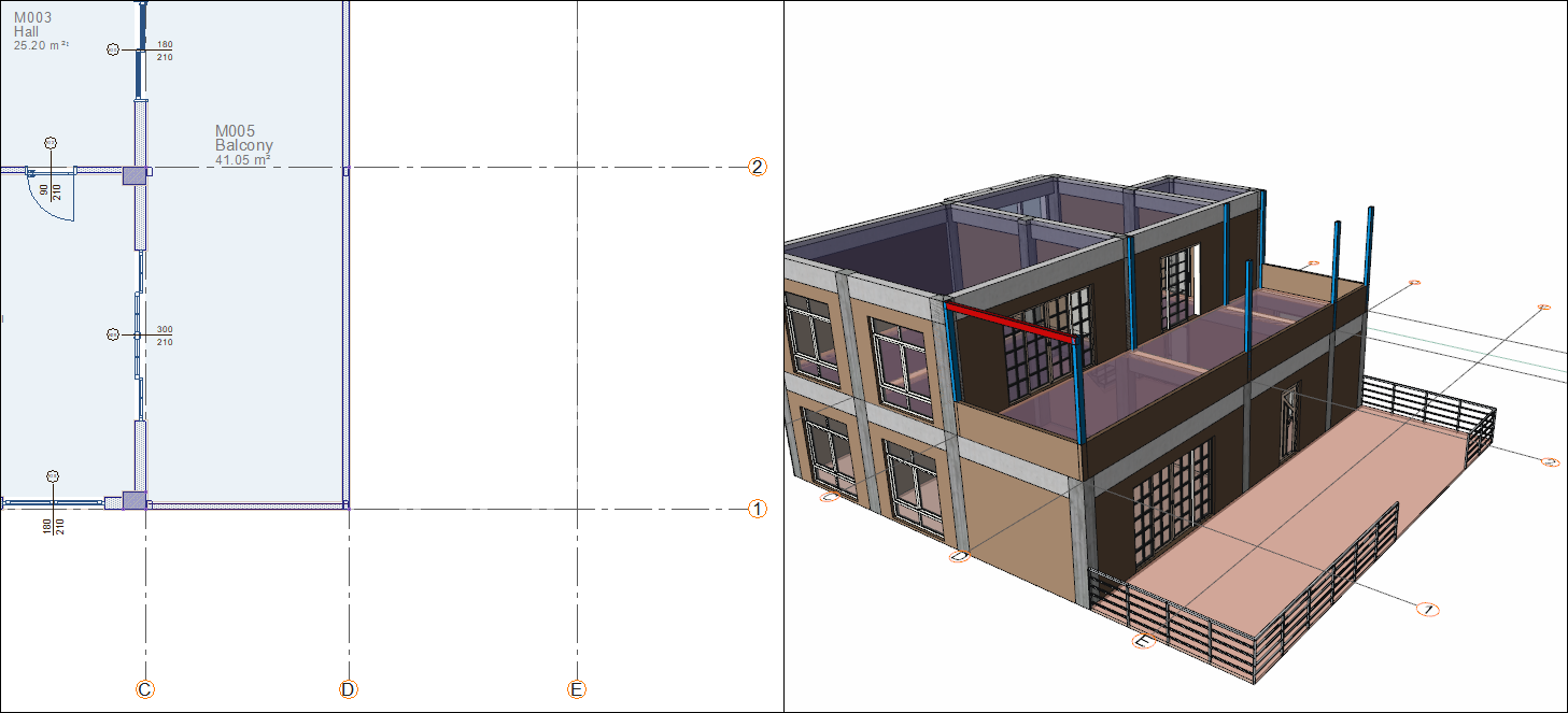 Click on the D-3, D-2 and D-1 axis intersections respectively. Steel beams will be formed.