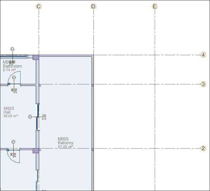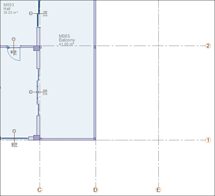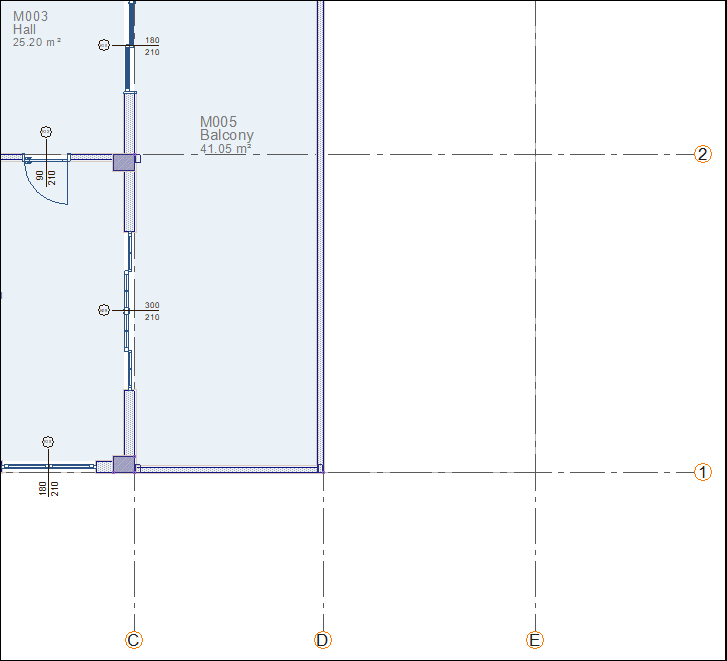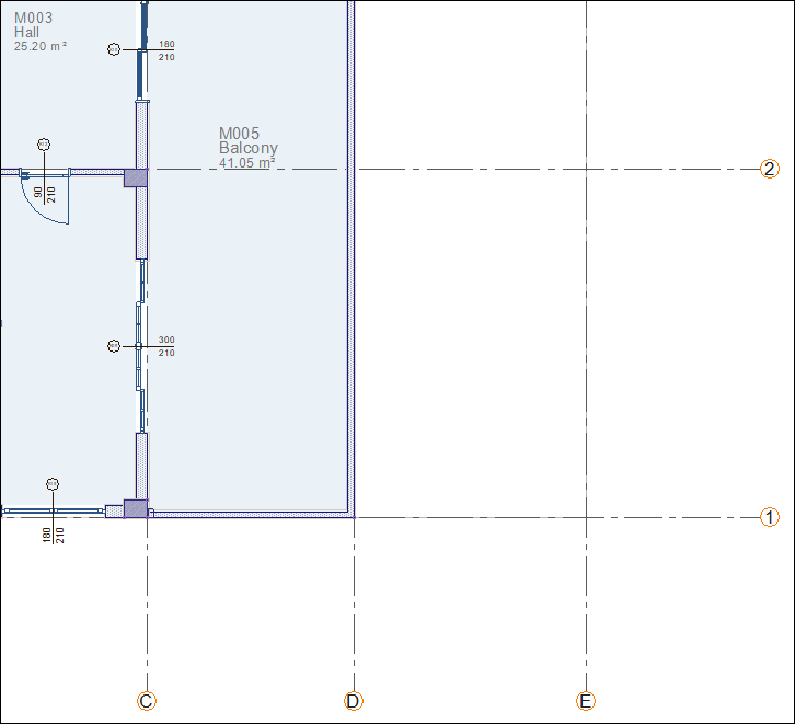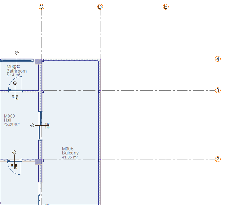 Change the column reference point by pressing the spacebar on the keyboard and bring the 15 cm side of the column on axis D. Place it by clicking the left mouse button.