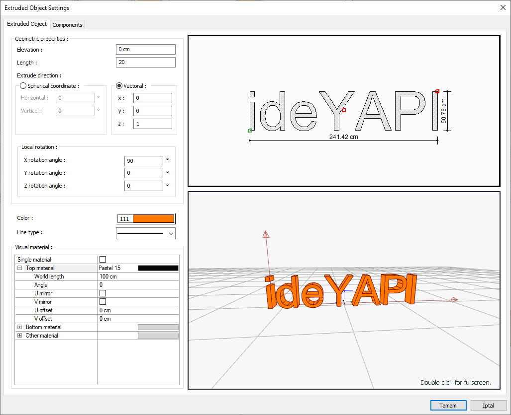 When the properties of the 3D text are entered, the settings of the text such as angle, material, and elevation can be changed.