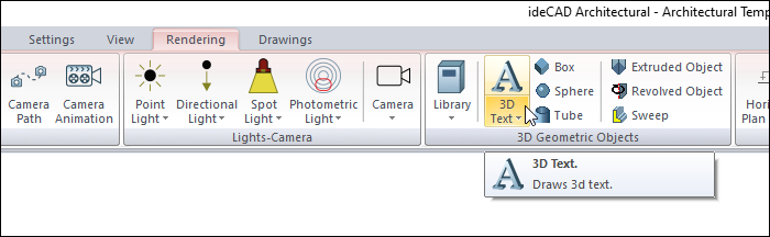 Click on the 3D text command on the Rendering tab on the ribbon menu.