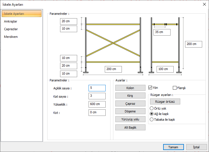 In the settings dialog, set the properties of the scaffolding such as element sections, anchor points, brace positions and click the OK button.