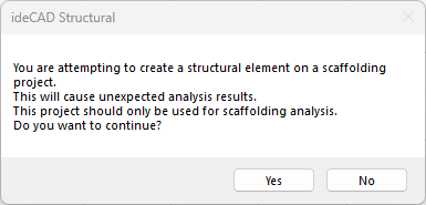If an attempt is made to create a structural element in projects converted to scaffolding projects, a warning dialog will appear. In projects that are converted into scaffolding projects, no more analysis and design is made for concrete and structural steel elements. Only suitable analysis and design is made for the scaffolding elements.