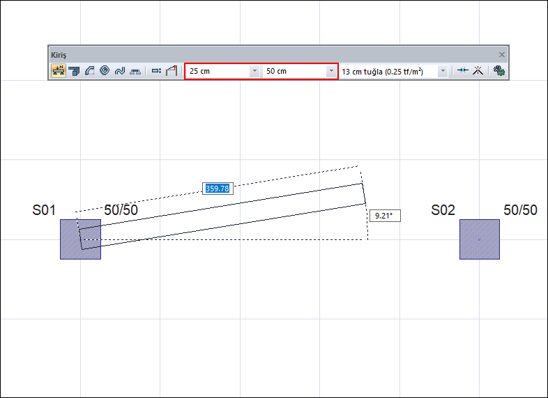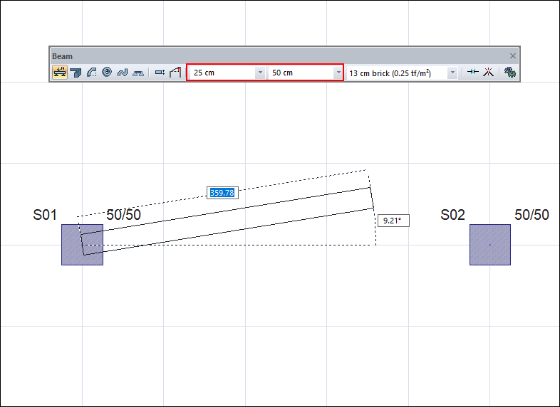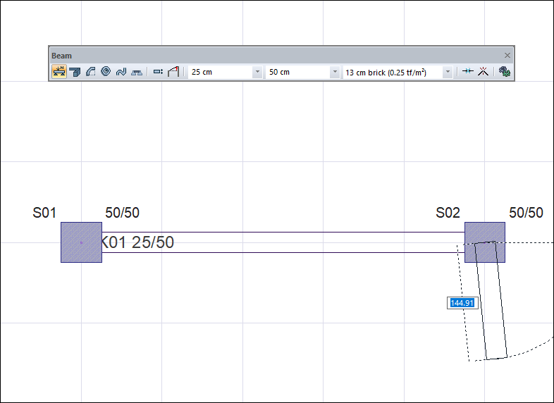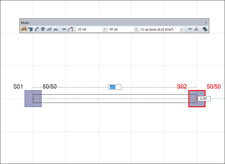 Creating the second point of the beam by hovering the mouse over the second column ![]() |