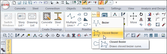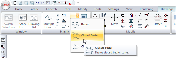 The closed bezier command creates a closed bezier curve in the project. Bezier curve design is made by defining more than one point.