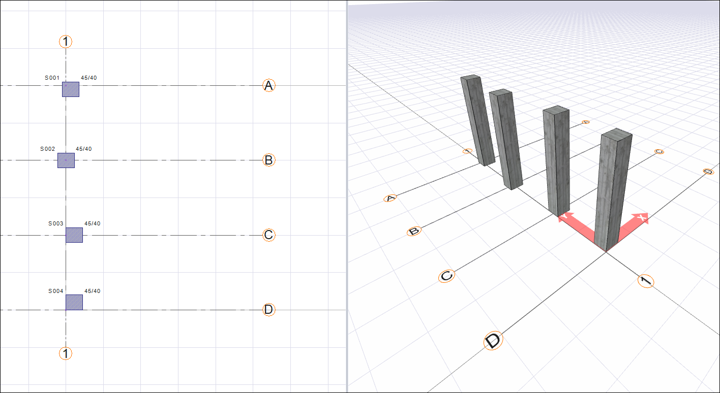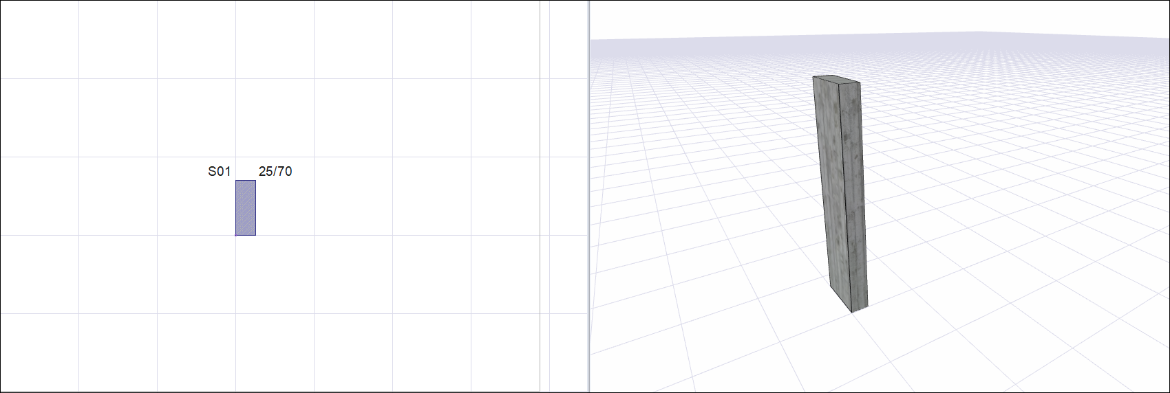 Left middle aligned column ![]() It is used to define a rectangular column just aside without entering the column settings. The column node is located at the midpoint of the left side of the column. For a column that is adjacent to the other side, it is necessary to enter the dimensions of the column in reverse. (e.g. 25/50 instead of 50/25). It can also be operated by pressing the 2 key on the keyboard while in column mode. |