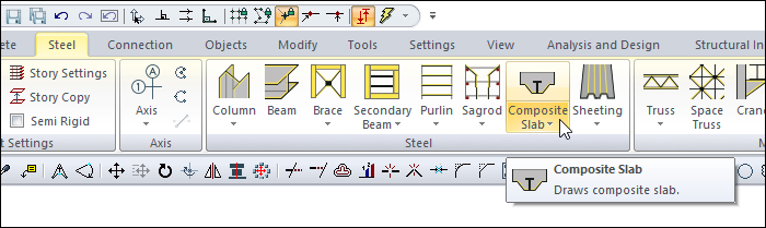 Trapezoidal sheet composite slab is created with Composite Slab command .Trapezoidal sheet composite slab is the load-transferring elements drawn between steel beams and on secondary beams. According to the working principle, the lower end of the trapezes and the heads of the secondary beams should be connected to each other at 90°.