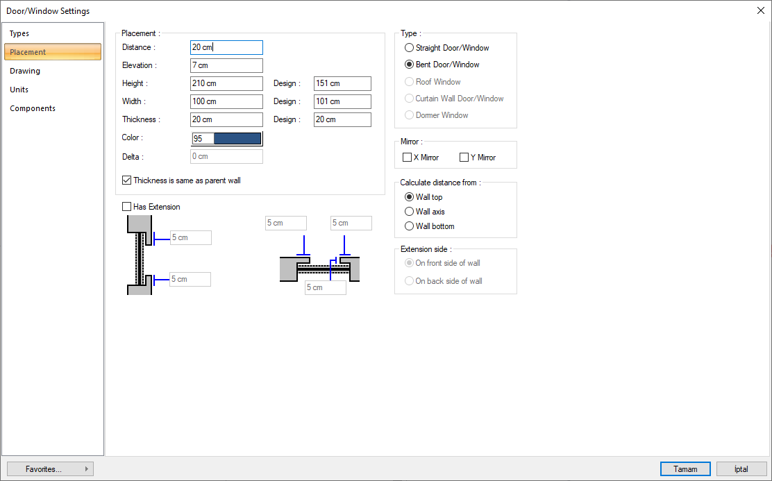The Door/Window Settings dialog will open. You can change the width and height of your door / window from the Placement in this dialog . After making the changes you want, click the OK button to close the dialog.
