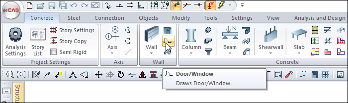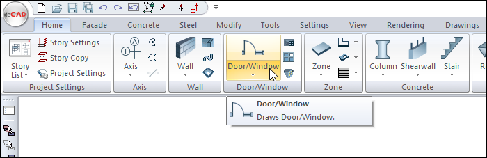 With the Door/Window command, doors/windows are created on the walls. Doors/windows are defined as in-wall objects. In order to draw doors/windows, walls are needed first.