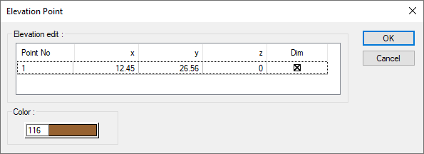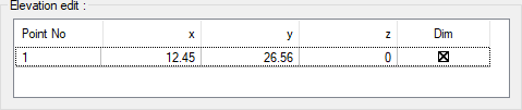 Elevation edit ![]() The coordinates of the elevation point placed are given. If wanted, a new value can be entered in the z box. |