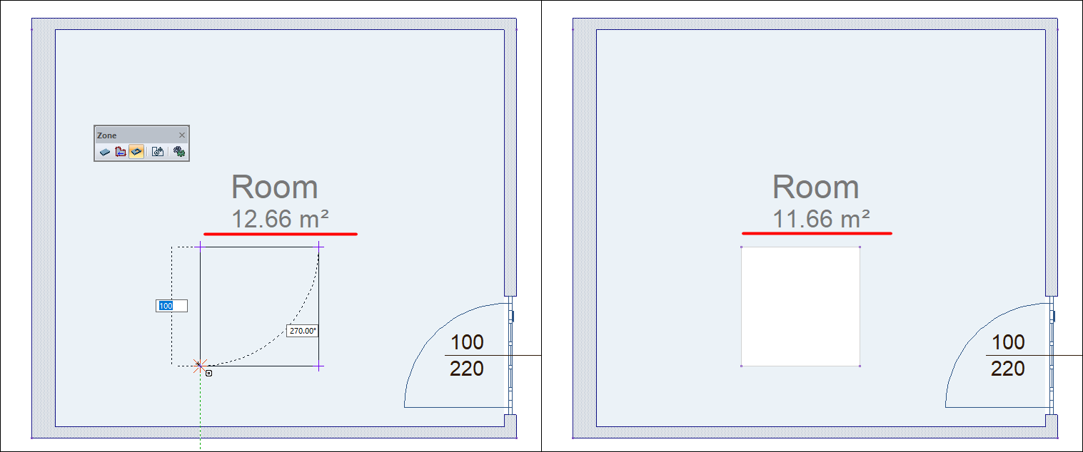 The space of the hole falls automatically from the area of the zones and reflects on the square meters of the zone simultaneously.