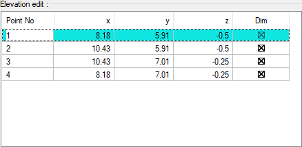 Elevation edit ![]() The coordinates of the elevation points placed are given. If wanted, a new value can be entered into the z box. |