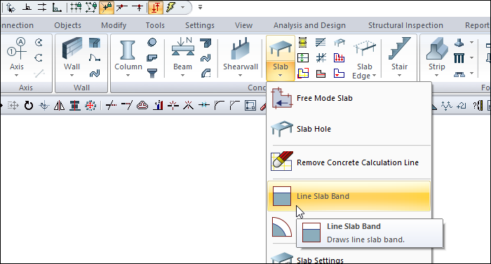 With the line slab band command, constructive beams are created at the idle shearwall ends in tunnel formwork projects. Slab band beams are not used in the analysis.