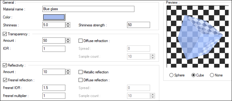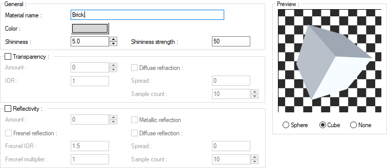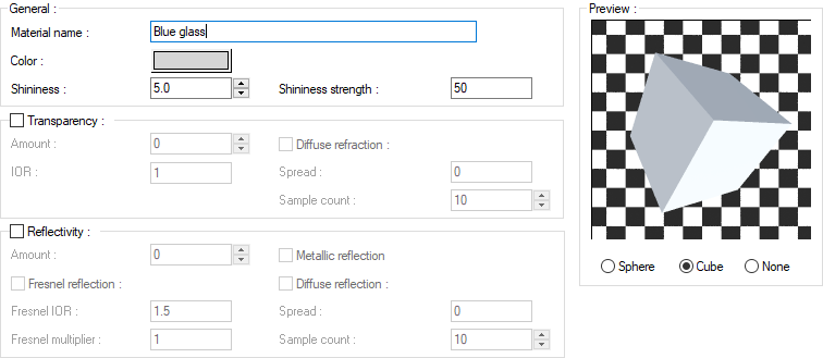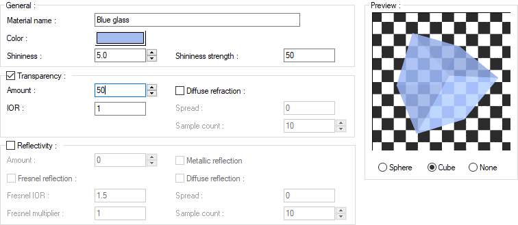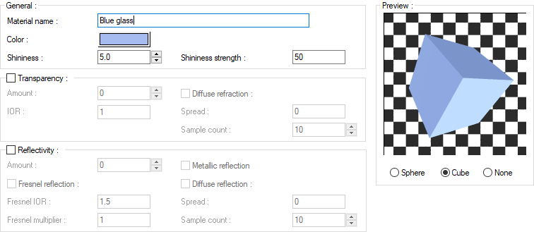 In the material editor dialog, you can define properties such as transparency and reflectivity to your material.