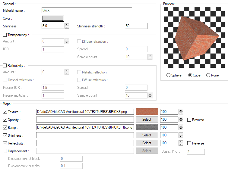 Likewise, you can add opacity, bump, shininess and reflectivity on sections in the maps section.