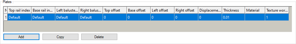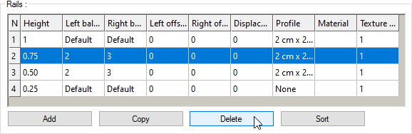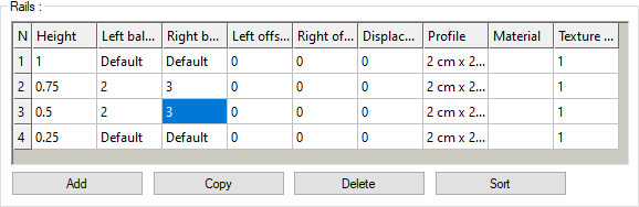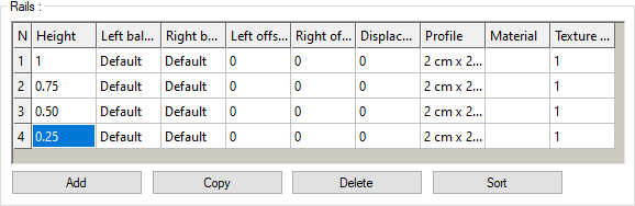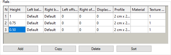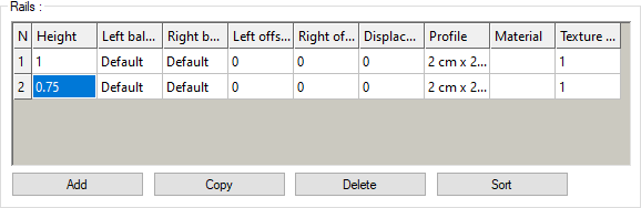 In the rail profiles table, in the first row named N = 1, make the height 1 meter and click the profile column.