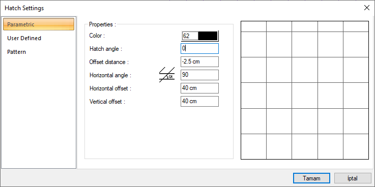 Parametric Hatch is a type of hatch where interspersed lines are intersected. The distance between the lines, the angle and the hatch global angle are set.