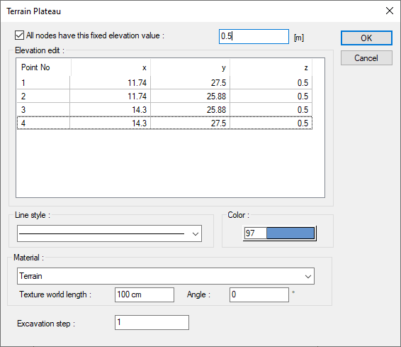 Entering the elevation value (50 cm) into the terrain toolbar opened while in the Plateau command ![]() |