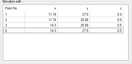 Elevation edit ![]() The coordinates of the elevation points placed are given. If wanted, a new value can be entered into the z box. |