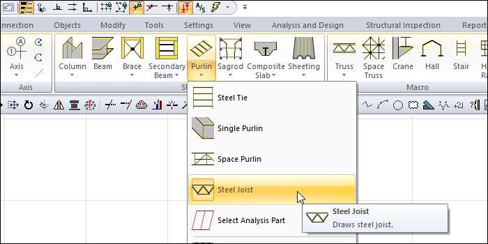 Select a profile from the list by clicking on the profile list in the steel purlin toolbar.