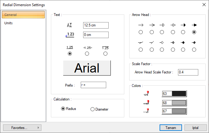 Arrow head ![]() One of the 12 display types given for the radius dimension arrow head is selected. |