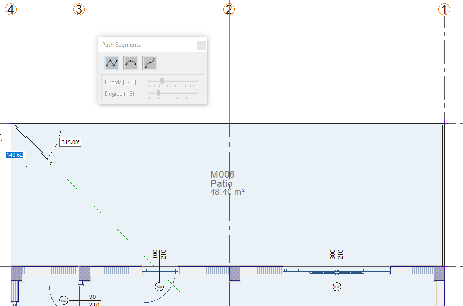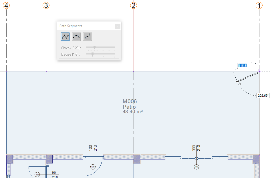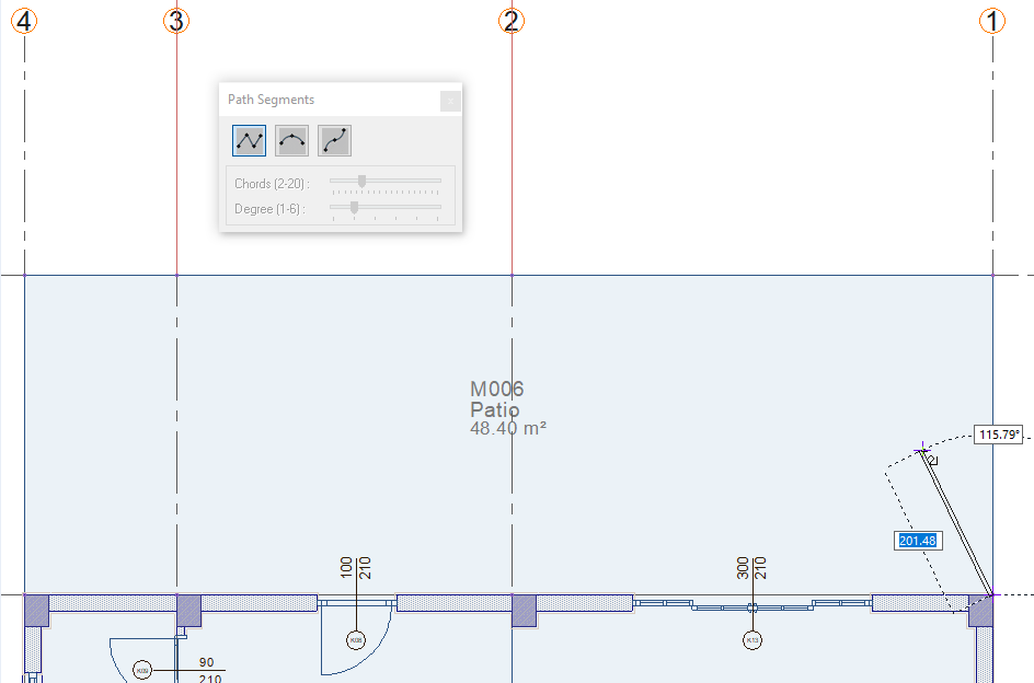There are icons in the Path Segments toolbar that allow you to draw the railing line in a straight, circular and curved form.