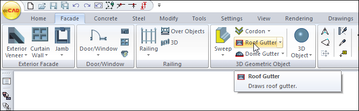 Roof gutter command creates a roof gutter object by default, with a selected profile.