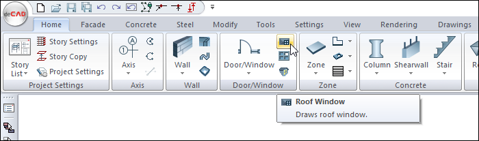 With the Roof Window command, parallel windows compatible with the roof pitch are created. In order to draw a roof window, a roof is needed first.
