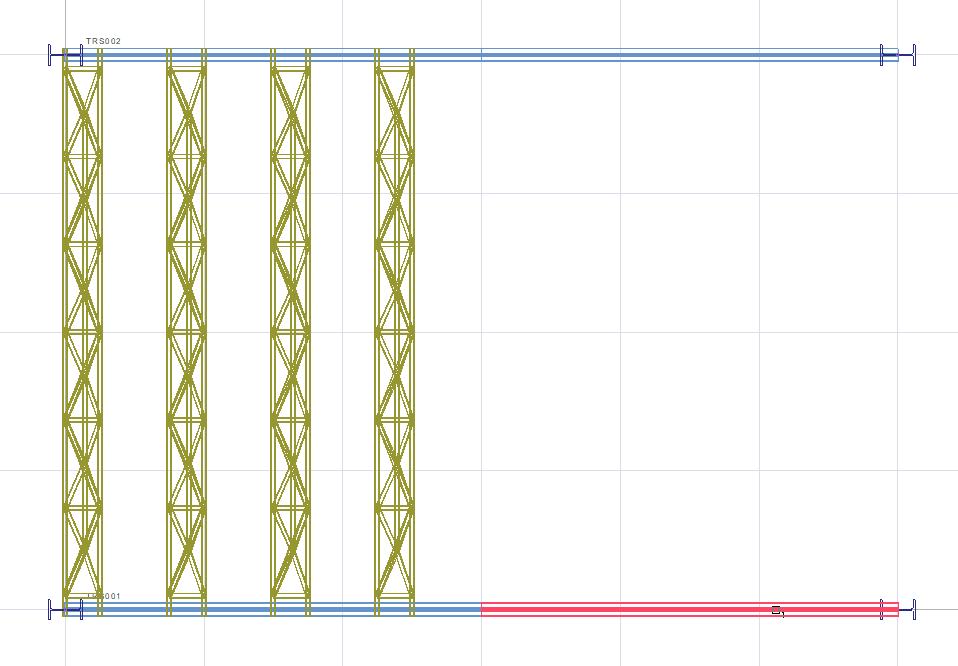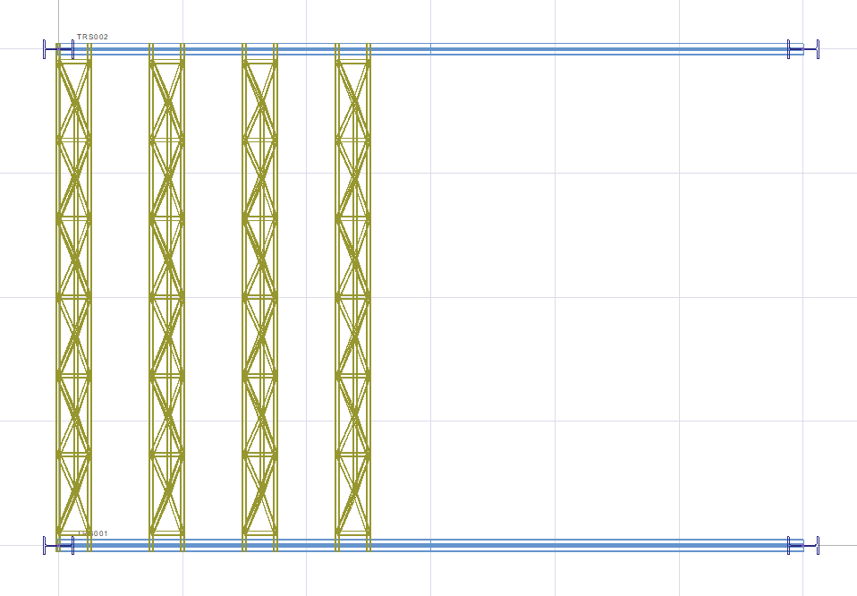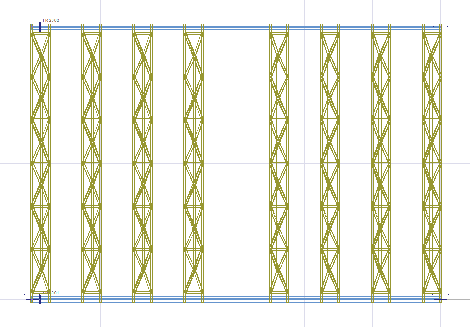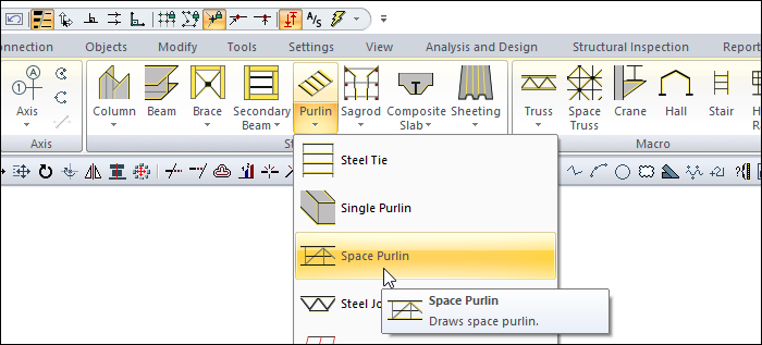 Space purlins of steel design are created with the Space Purlin command. Space purlins are elements drawn between steel beams and constructed from a mesh of steel bar elements.