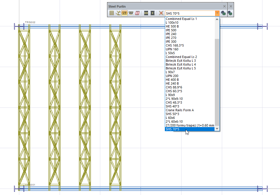 Select a profile from the list by clicking on the profile list in the steel purlin toolbar.