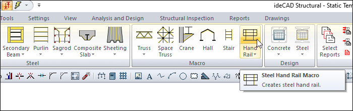 With the Steel Hand Rail Macro command, steel hand rails are created by reference to steel beams. With the steel hand rail macro command, steel hand rails are also created on steel stairs.