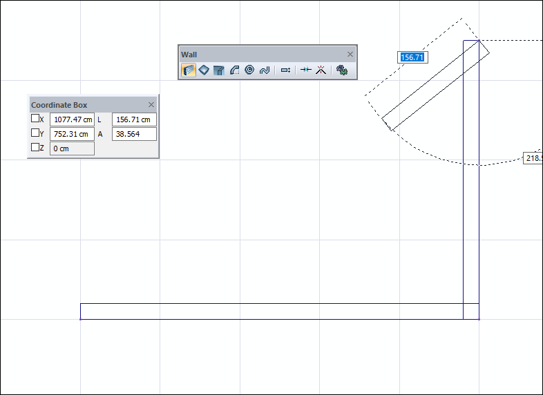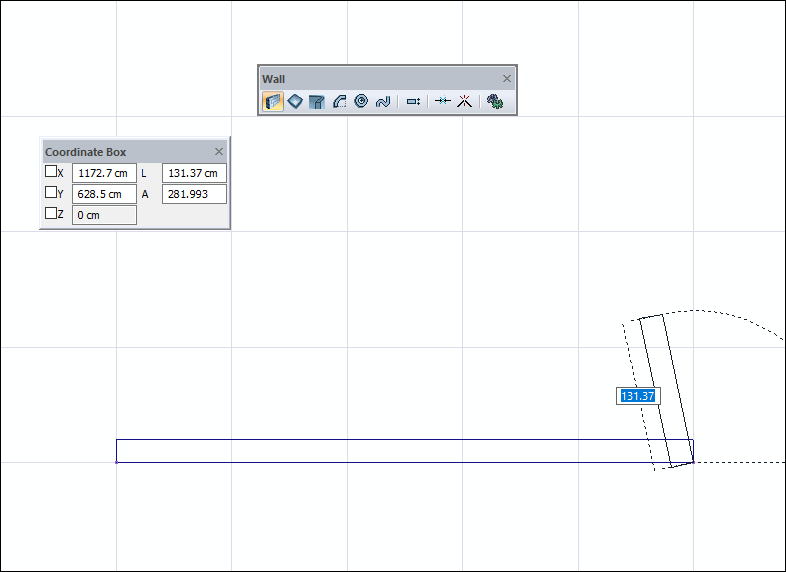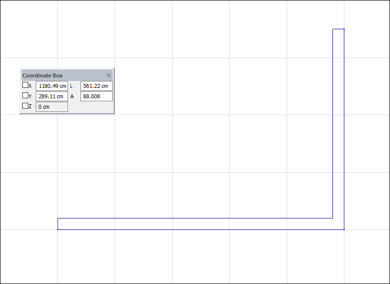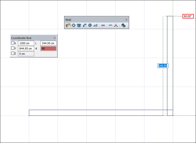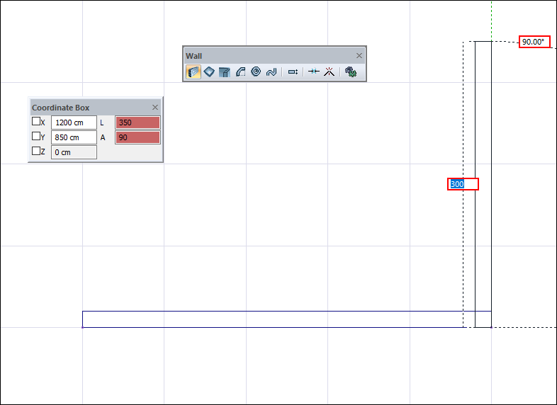 To enter the length , press the L key on the keyboard . The cursor will go to the L digit in the coordinate box . Enter here 350 (cm) as the length value and press enter. The wall being drawn will be limited by the length value.