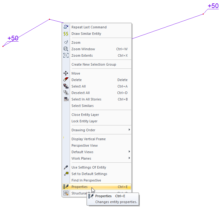 Select the elevation line you want to enter its settings and click the Properties line from the menu that opens by clicking the right button of the mouse .