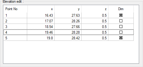 Elevation edit ![]() The coordinates of the elevation points placed are given. If wanted, a new value can be entered in the z box. |