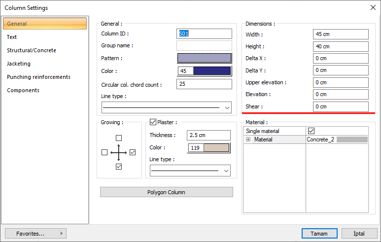 All columns (rectangle, circle, polygon) you enter will be inclined columns unless you enter the column settings dialog again and enter the Shear parameter to zero again.