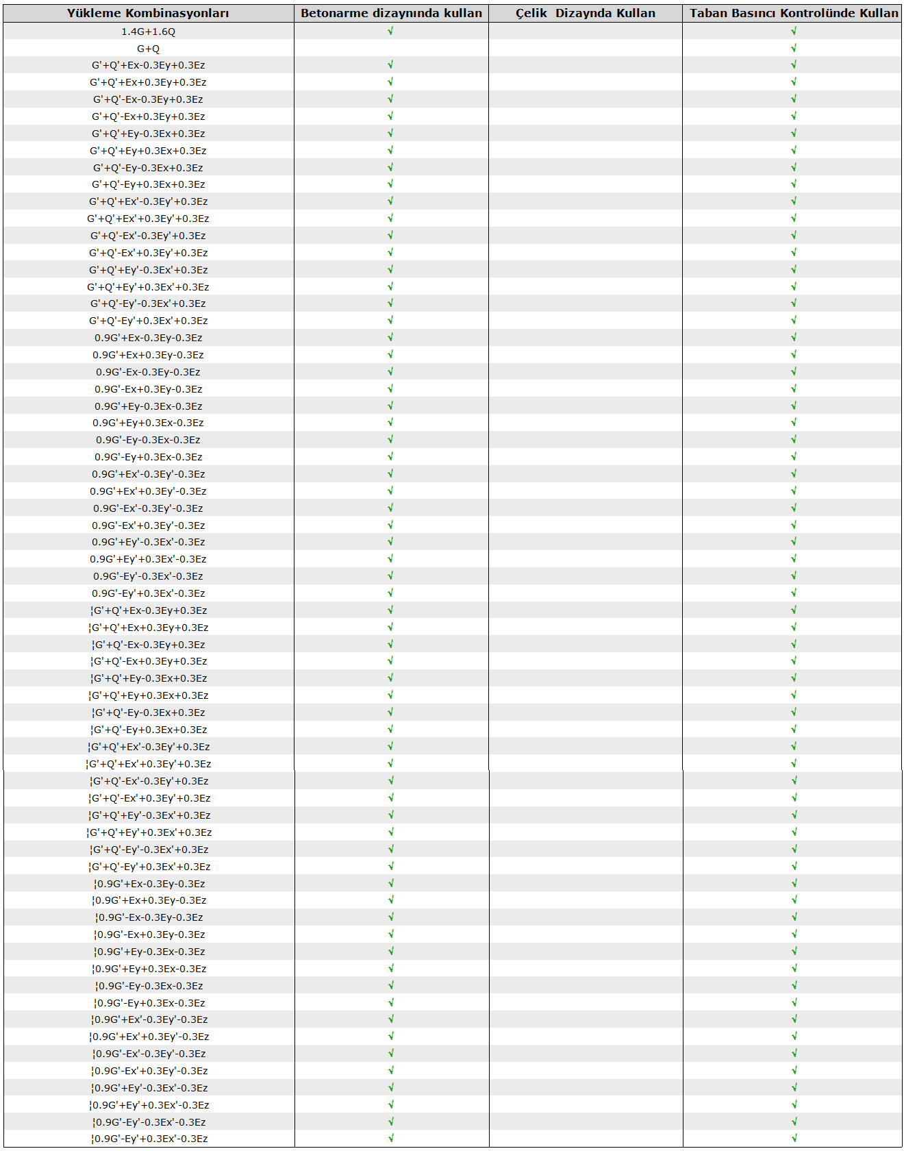 The loading combinations created automatically by the program using TS 500 and TBDY 2018 for the building can be checked from the Building Tree and Selective Report .
