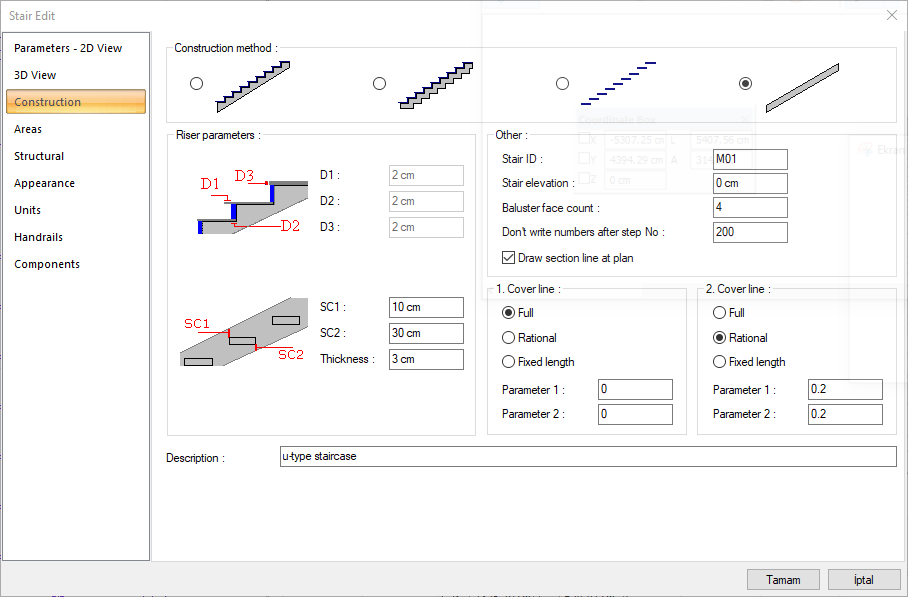 The stair areas dialog will open. Edit the geometric parameters regarding the ramp in the dialog. You can enter 60 cm in stair height. You can rearrange these settings after creating the ramp.