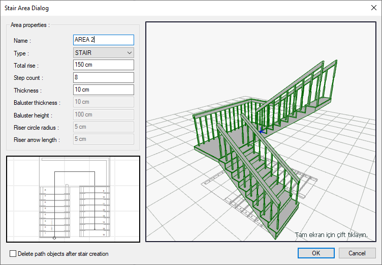 The stair areas dialog will open. Edit the geometric parameters regarding the stair flight in the dialog. You can enter 150 cm for the stair height and 8 for the number of steps. You can rearrange these settings after creating the stair.