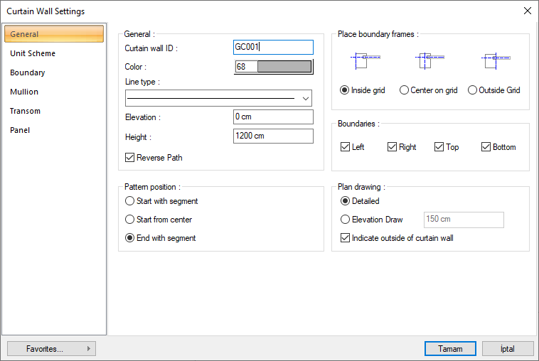 Elevation draw ![]() It determines the plan drawing of the curtain wall element. For example, if the value is 1.5 meters on a facade with a height of 15 meters, the facade is cut from a height of 1.5 meters and its plan is drawn to look down. |