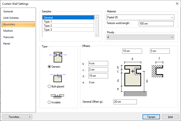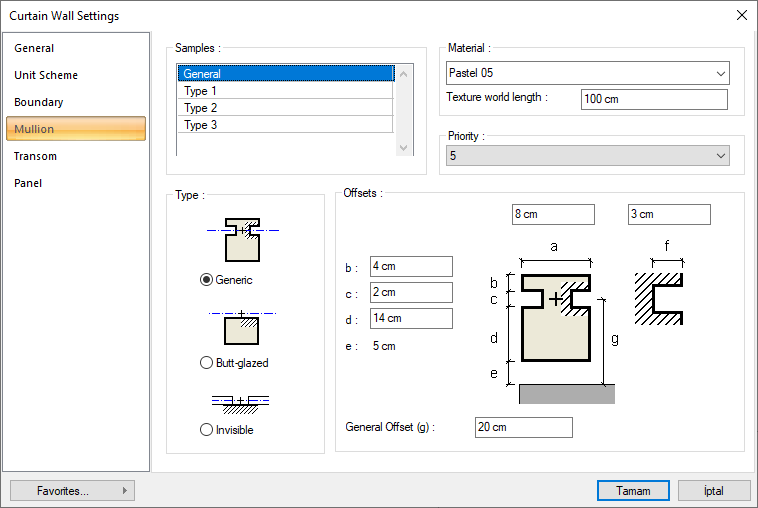 Offsets ![]() The geometric properties of the profile forming the curtain wall element mullions are given according to the parameters shown in the diagram. These parameters can change according to the generic, butt-glazed and invisible type. a : Profile size is entered and will be used as the cover width. |