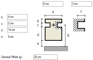 Offsets ![]() The geometric properties of the profile forming the curtain wall element transoms are given according to the parameters shown in the diagram. These parameters can change according to the generic, butt-glazed and invisible type. a : Profile size is entered and will be used as the cover width. |