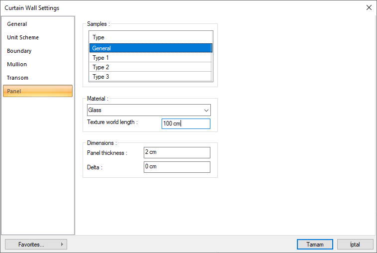 Mullions ![]() The number of parts to be formed in the vertical direction of the module forming the curtain wall element and their intervals are set in this table. While a new record is opened with the Add button at the bottom, an existing record is deleted with the Delete button. In the vertical recording intervals column of the table, give the distance between the two records in turn. The created partition can be followed in the preview box on the right. |