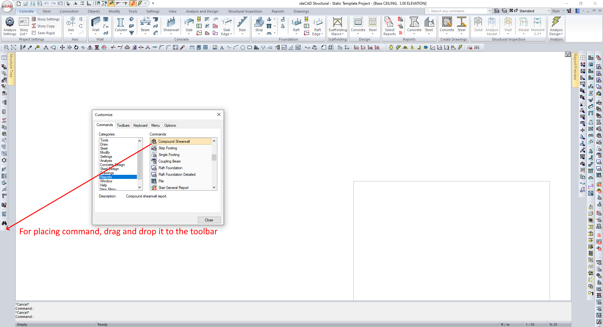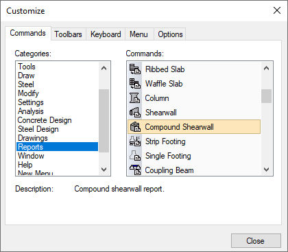 In the dialog that opens, access the command you want from the Categories section. For example, select Report from the Categories section.