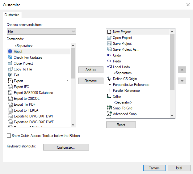 In the right-click menu opened by clicking the right mouse button on the ribbon menu, a command can be added and removed from the toolbar in the upper left corner with "Customize Quick Access Toolbar" .