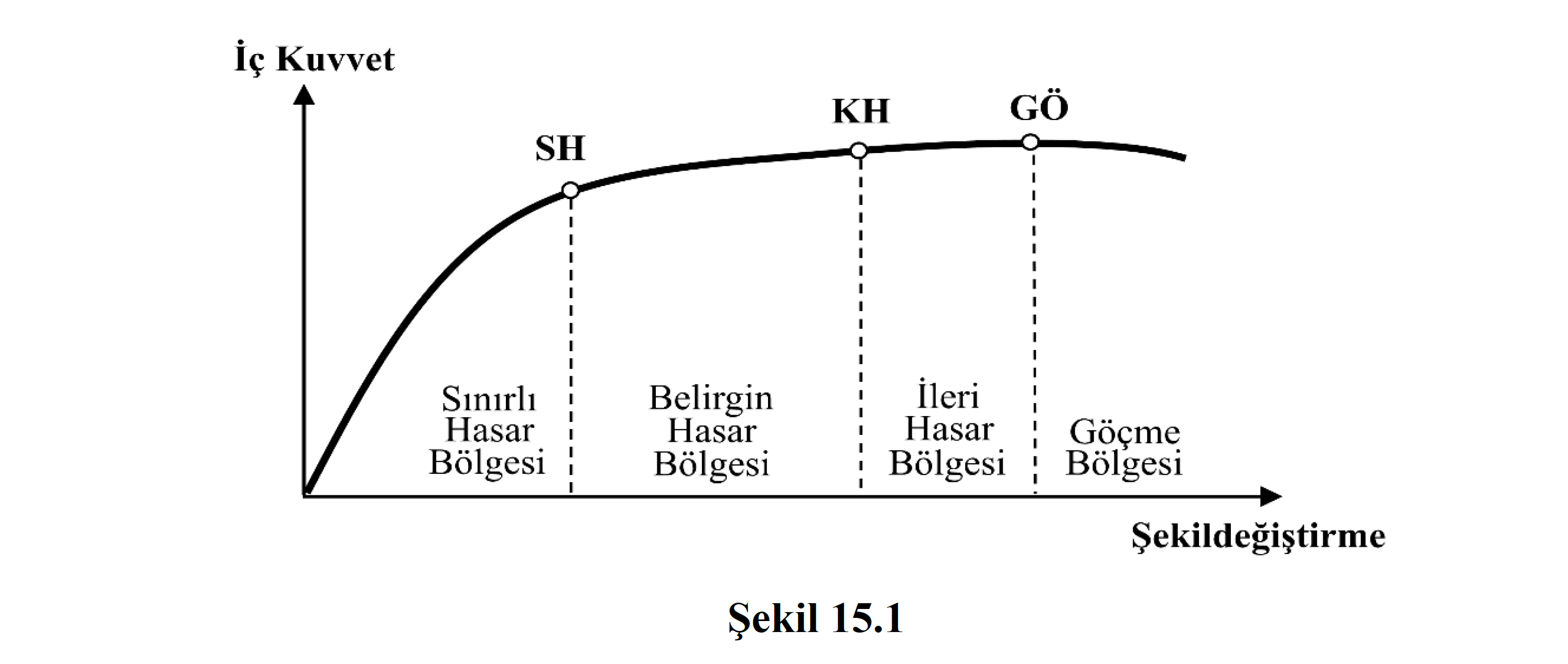 Elements whose critical section damage does not reach SH are located in the Restricted Damage Zone , the elements between SH and KH are in the Significant Damage Zone , the elements between KH and PO are in the Advanced Damage Zone , and the elements exceeding the DE are in the Migration Zone . (Figure 15.1) .
