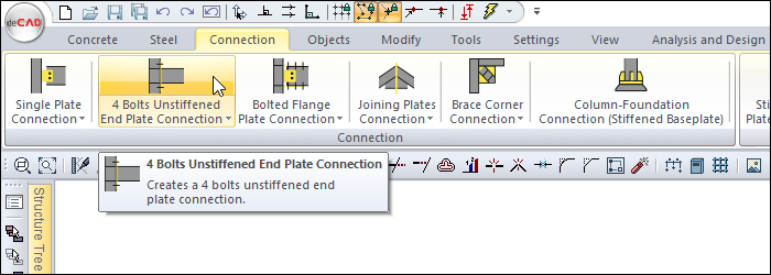 From the Connection menu, click the 4 Bolts Unstiffened End Plate Connection icon.