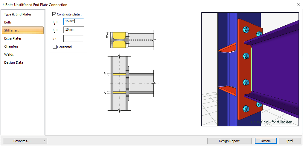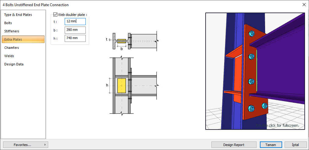 Web doubler plate ![]() If the column body thickness is insufficient, web doubler plates are used to meet the shear effect of the panel area. If the web doubler plate will be made, the option is marked. Web doubler plate is determined by entering values. The values to be entered are shown in the schematic drawing. |