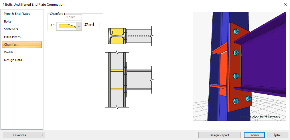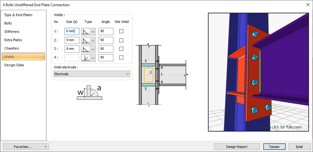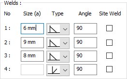 Welds ![]() The thickness, type and angle values of the welds to be made at the connections are given. The information on whether it will be done on the construction site or not is entered. |