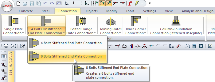 From the Connection menu, click on the icon for 8 Bolts Stiffened End Plate Connection.