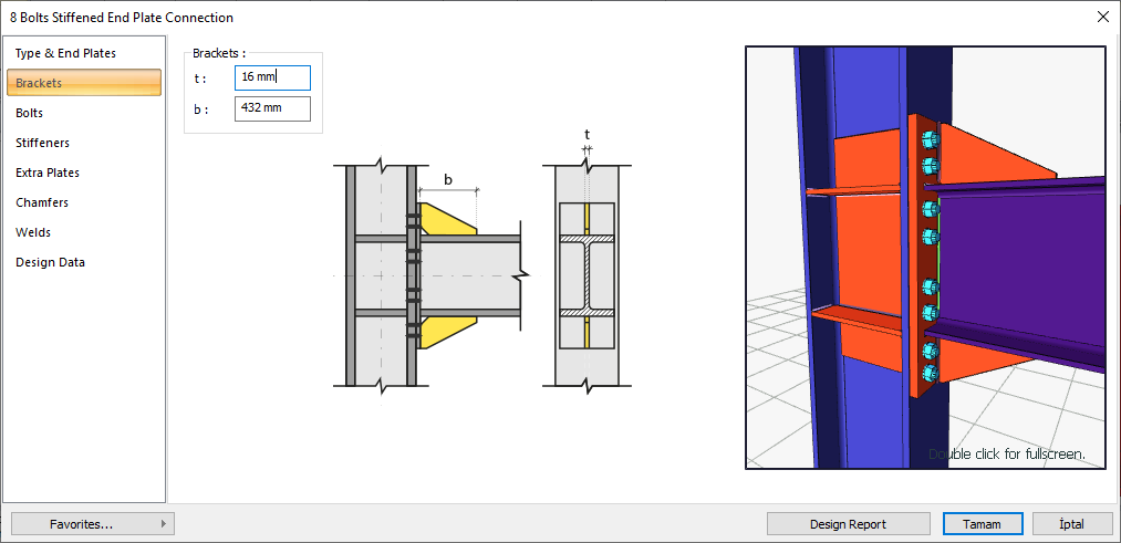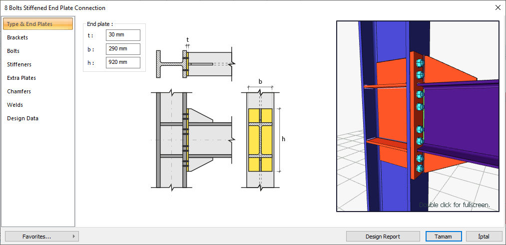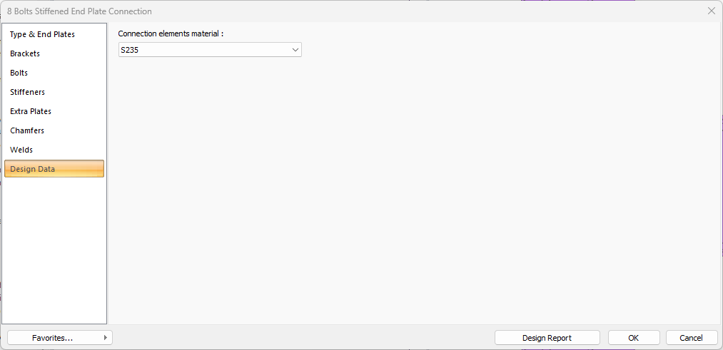 The 8 bolts stiffened end plate connection settings dialog will open.