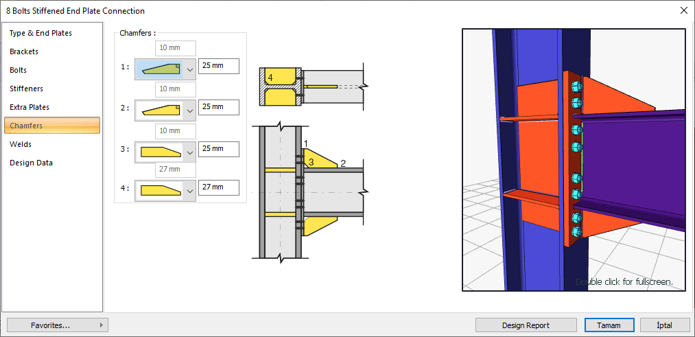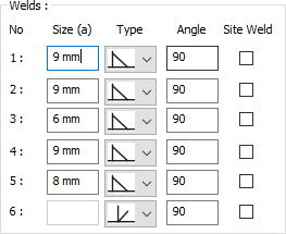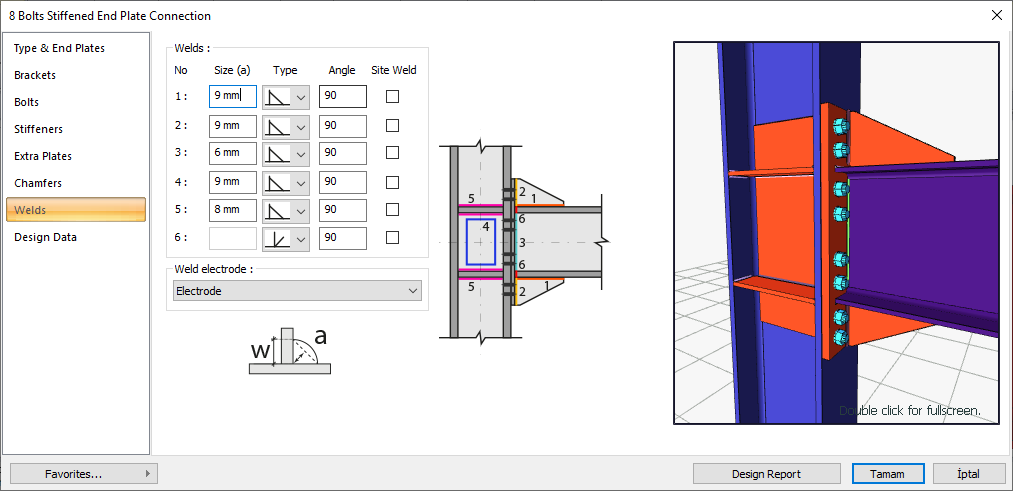 Welds ![]() The thickness, type and angle values of the welds to be made at the connections are given. The information on whether it will be done on the construction site or not is entered. |